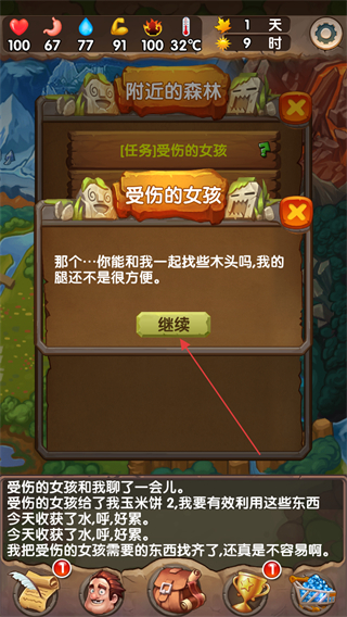 4、提交草藥后,查看新任務(wù)提示,點擊繼續(xù),按要求幫助女孩尋找木頭,獲取獎勵。