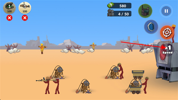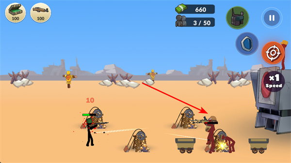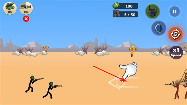 1、根據(jù)手勢指引,點擊箭頭標識區(qū)域,可指揮火柴人士兵移動,調(diào)整其戰(zhàn)斗位置,更好參與戰(zhàn)斗。