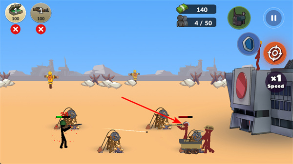 3、操控己方戰(zhàn)斗單位攻擊敵方火柴人,通過持續(xù)打擊削弱敵方戰(zhàn)力,推進戰(zhàn)斗進程,爭取勝利。