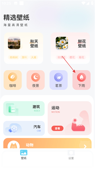 1、在背景圖的精選壁紙頁面,點擊下雨,進入下雨壁紙頁面。