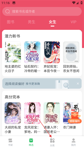 1、點(diǎn)擊百度閱讀器首頁底部的分類,進(jìn)入分類頁面。