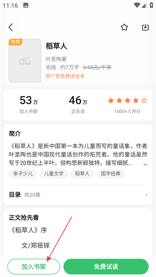 3、在書籍詳情頁面,點(diǎn)擊加入書架,即可將該書籍加入書架。