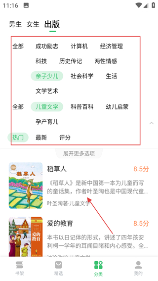 2、在分類頁面,篩選分類選擇想看的,進(jìn)入書籍詳情頁面。