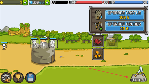 3、戰(zhàn)斗中獲取金幣,當(dāng)金幣數(shù)量足夠,點(diǎn)擊升級(jí)選項(xiàng),如UPGRADEARCHER花費(fèi)25G升級(jí)弓箭手提升戰(zhàn)力。