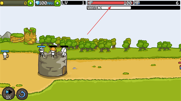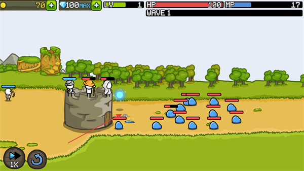 2、戰(zhàn)斗開始,留意屏幕上方WAVE1標(biāo)識(shí),此時(shí)進(jìn)入第1波敵人進(jìn)攻,城堡上的弓箭手會(huì)自動(dòng)攻擊。
