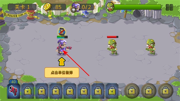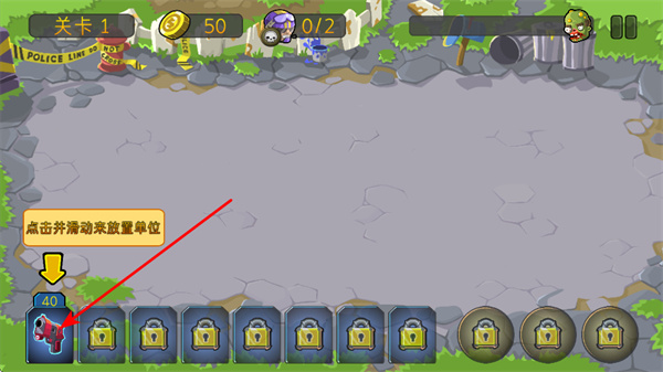 1、點(diǎn)擊滑動(dòng)下方單位圖標(biāo),在場(chǎng)景中放置戰(zhàn)斗單位,抵御僵尸進(jìn)攻基礎(chǔ)操作,布置構(gòu)建防御陣線。