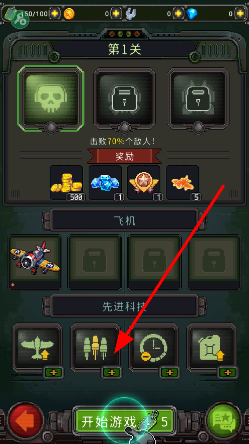 1、準備階段,對飛機的先進科技等技能進行升級,點擊技能旁的加號,提升技能,為戰(zhàn)斗做好準備,然后點擊開始游戲,進入關(guān)卡挑戰(zhàn)。