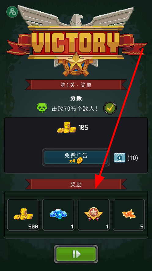 4、持續(xù)攻擊敵人,完成關(guān)卡要求,如擊敗一定比例的敵人,成功后就能獲得勝利,此時會展示勝利界面,給出分數(shù)以及金幣、鉆石等獎勵。