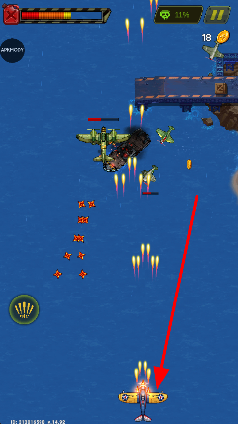 1、操控飛機(jī)在畫面中左右移動,躲避敵人的攻擊,同時調(diào)整位置,讓飛機(jī)能更好地對敵人發(fā)起進(jìn)攻,在復(fù)雜的戰(zhàn)場環(huán)境中靈活穿梭。