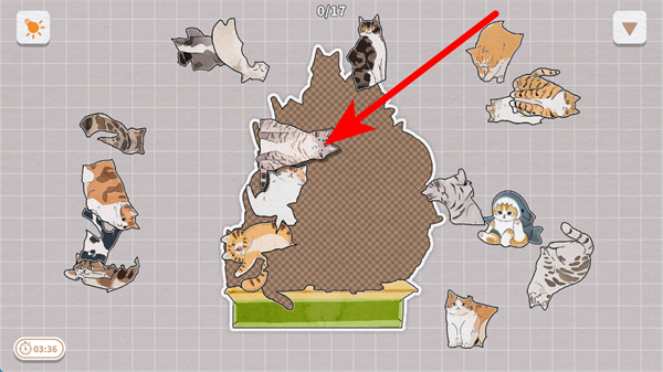 1、進(jìn)入游戲后,會(huì)看到散落的貓咪拼圖碎片,玩家可以開(kāi)始拼接操作,留意碎片的形狀與圖案特征進(jìn)行拼圖。