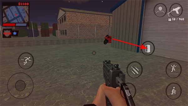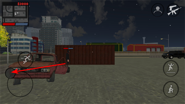 1、通過左側的虛擬搖桿操控角色移動,城市場景中探索,尋找武器和任務目標,是角色行動基礎操作。