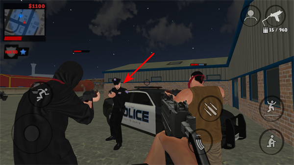 4、與敵人如警察交戰(zhàn)時,利用購買的武器進行射擊,可獲取金錢和經驗,推進進程,完成任務。