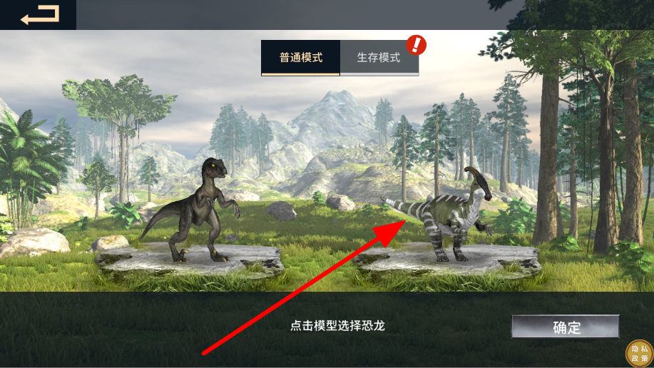1、進(jìn)入游戲后,恐龍選擇界面,點(diǎn)擊心儀的恐龍模型,選定后點(diǎn)擊確定,即可進(jìn)入恐龍的冒險場景。