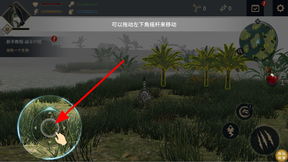 2、在游戲世界的場景中,拖動左下角搖桿,控制恐龍移動,自由探索場景,尋找目標(biāo)生物或資源。
