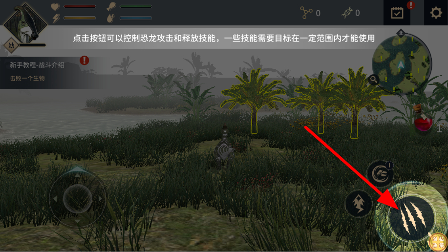3、點(diǎn)擊右側(cè)攻擊或技能按鈕,能控制恐龍發(fā)起攻擊、釋放技能,部分技能需目標(biāo)在一定范圍內(nèi)才可使用。