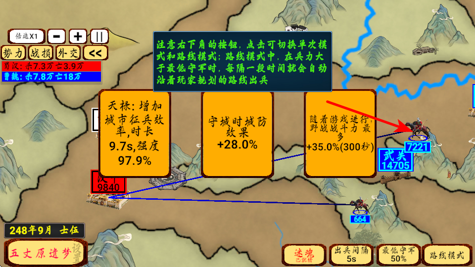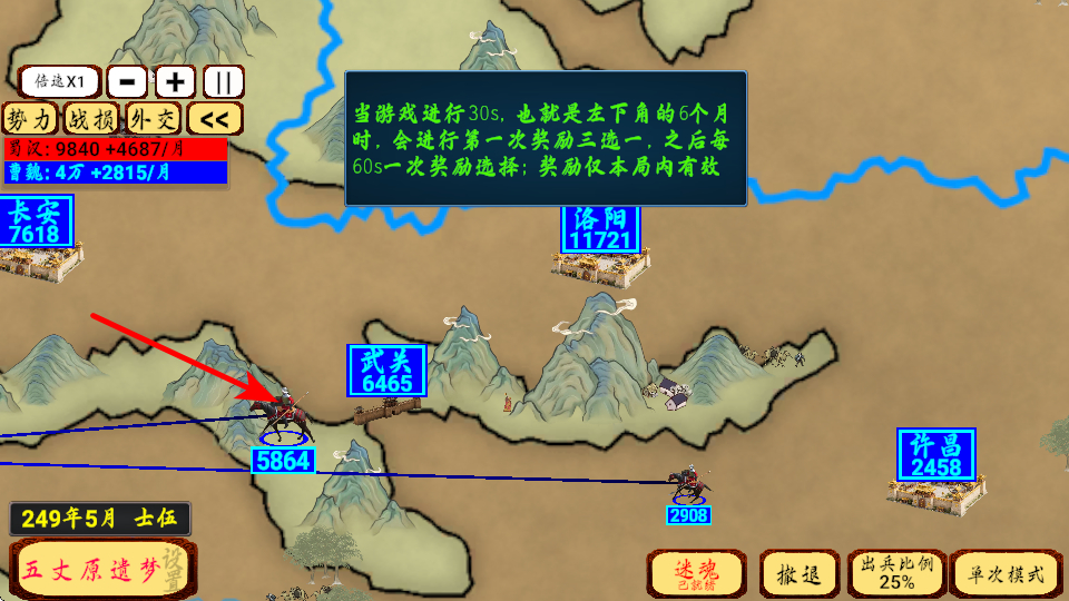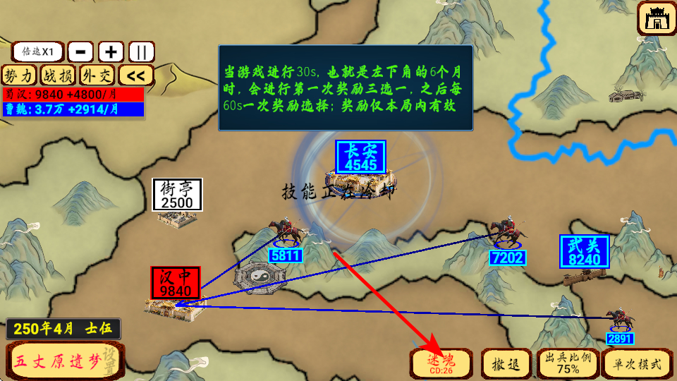 4、合理使用技能迷魂,在關(guān)鍵時刻干擾敵方,配合兵力優(yōu)勢推進戰(zhàn)線,快速占領(lǐng)關(guān)鍵城市如長安,擴大勢力范圍。