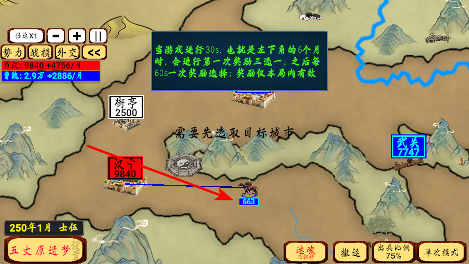3、出兵前需先選取目標城市,根據(jù)敵我兵力對比如漢中9840 vs 敵方663,確保兵力優(yōu)勢后再行動,提高占領(lǐng)成功率。