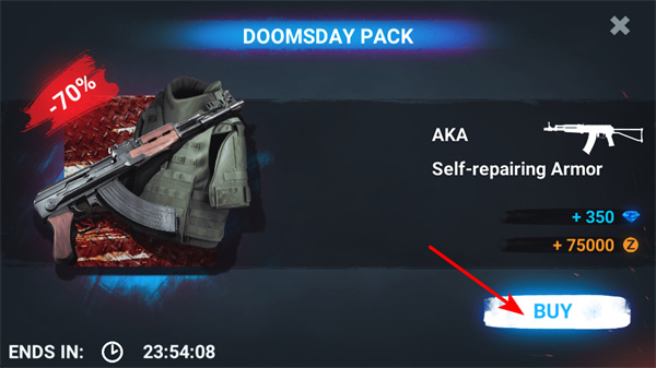 1、點(diǎn)擊BUY按鈕購買DOOMSDAY PACK,該禮包包含AKA步槍和自修復(fù)護(hù)甲,還附贈(zèng)鉆石和金幣,助力推進(jìn)。