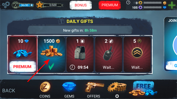2、領(lǐng)取每日禮物中的1500金幣,金幣可用于購買裝備、升級(jí)技能,是重要的資源積累途徑,保證資源充足。