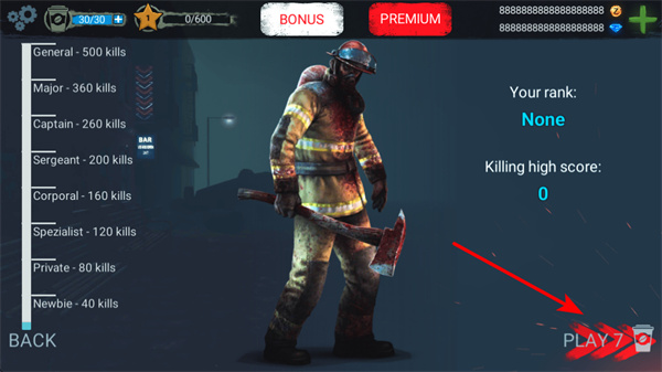 4、點(diǎn)擊PLAY按鈕進(jìn)入游戲,參與戰(zhàn)斗擊殺敵人,積累擊殺數(shù)以提升軍銜,軍銜提升可解鎖新技能和獎(jiǎng)勵(lì)。