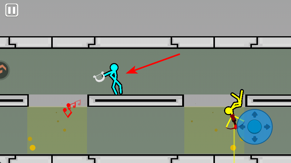 3、操控持豎琴的藍色火柴人,借助豎琴的攻擊效果,依據(jù)位置和行動,選擇時機發(fā)起攻擊。