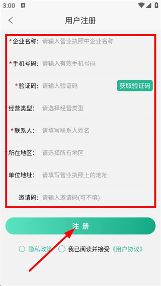 4、填寫企業(yè)名稱、手機(jī)號碼等信息,勾選協(xié)議后,點(diǎn)擊注冊,完成注冊操作。