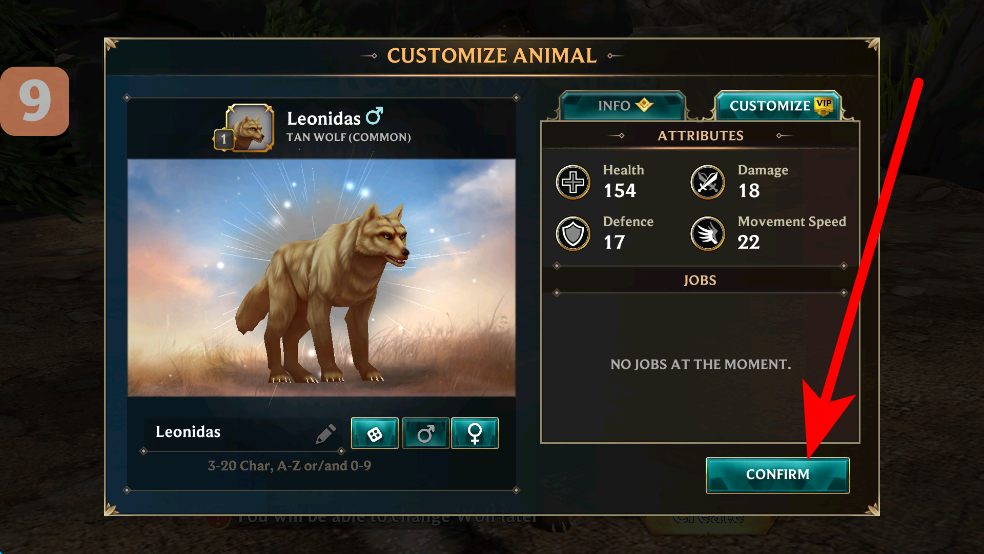 1、對狼的形象等進行自定義,在自定義界面設(shè)置好相關(guān)內(nèi)容后,點擊CONFIRM按鈕,即可確認更改,打造專屬的狼角色。