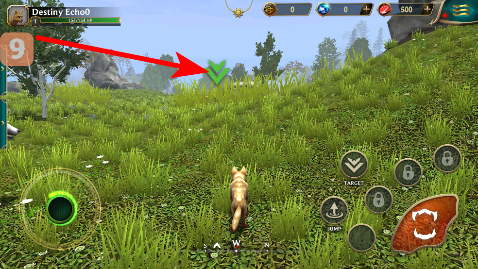 2、進入游戲后,通過左側(cè)虛擬搖桿操控狼的移動方向,朝著帶有綠色箭頭標(biāo)識的目標(biāo)位置前進,可探索不同區(qū)域。