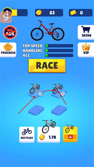 1、在游戲主界面,可查看自行車的TOP SPEED、HANDLING、ACC等屬性,點擊黃色RACE按鈕開始比賽。