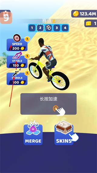 3、比賽過程中,在沙漠等賽道,可通過長按加速來提升速度,同時還能利用MERGE、SKINS等功能優(yōu)化自行車。