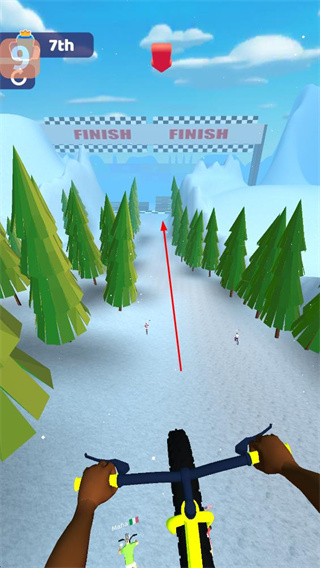 4、朝著FINISH終點線騎行,在雪地等不同賽道場景中,努力超越其他騎手,提升排名,爭取更好的比賽成績。