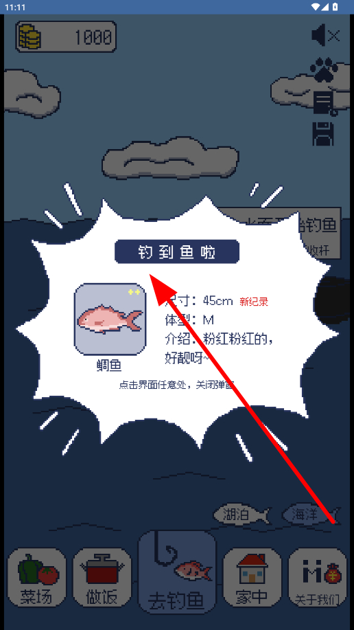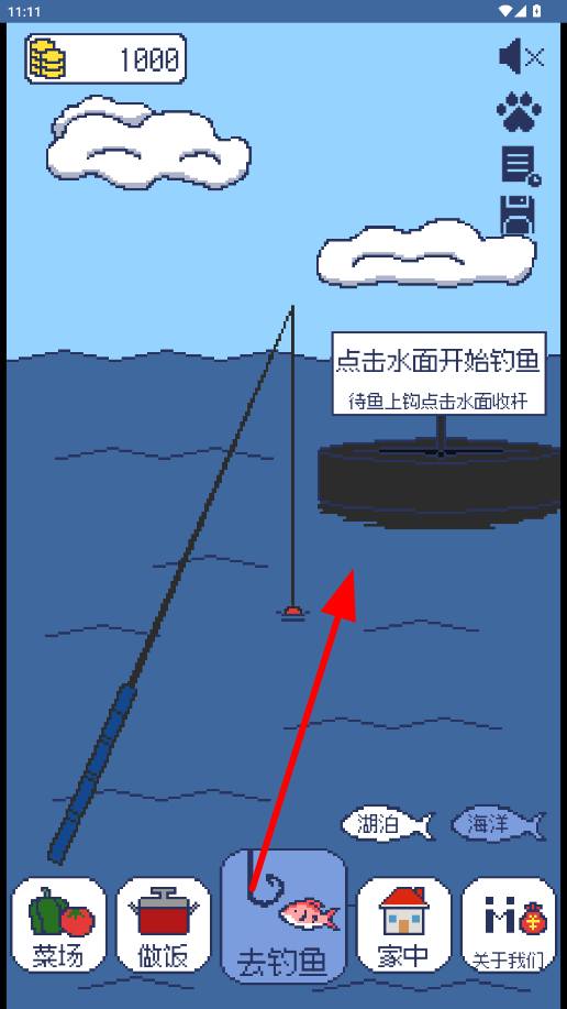 1、點(diǎn)擊去釣魚(yú),再點(diǎn)擊水面就能開(kāi)始釣魚(yú),等魚(yú)上鉤時(shí)在點(diǎn)擊水面收桿。