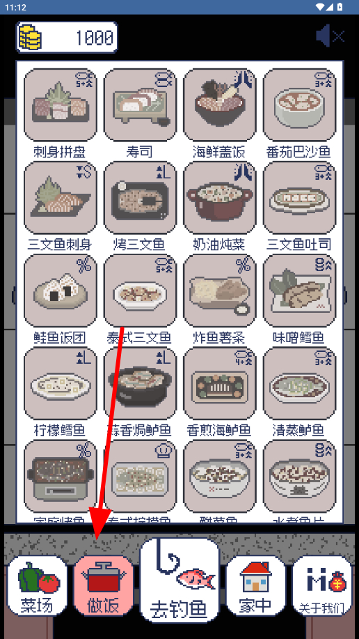 3、點(diǎn)擊做飯,能進(jìn)入菜譜界面,可以選擇用釣到的魚(yú)制作各種美食。