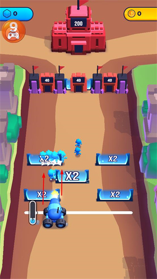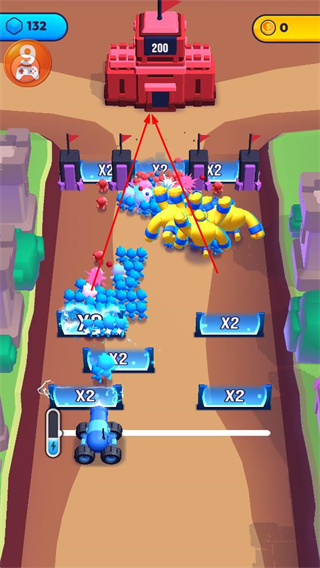 2、在關卡中,利用X2等倍數(shù)裝置,讓藍色小人數(shù)量倍增,壯大隊伍規(guī)模,為進攻助力。