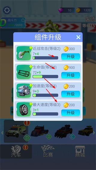 1、可對賽車組件進行升級,消耗金幣提升近戰(zhàn)攻擊、生命值、加速度、最大速度等屬性。