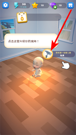 3、按照指引,點擊對應(yīng)圖標,可免費為寶寶添加第一張嬰兒床,開始對寶寶的房間進行初步升級。