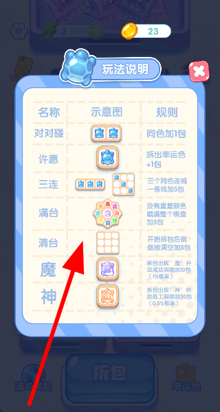 3、閱讀玩法規(guī)則說(shuō)明,熟悉對(duì)對(duì)碰三連等機(jī)制,按照規(guī)則進(jìn)行操作,提升游戲進(jìn)程推進(jìn)效率。