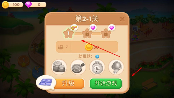 1、在關(guān)卡選擇界面,可選擇如第2-1關(guān)等關(guān)卡,點擊開始游戲進入,還可利用升級功能提升餐廳設(shè)施,使用助推器助力游戲。