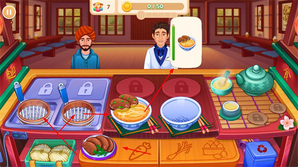 2、進入餐廳場景后,根據(jù)顧客訂單如包含肉丸的面食,在廚房中準備食材,利用蒸鍋等廚具制作食物。