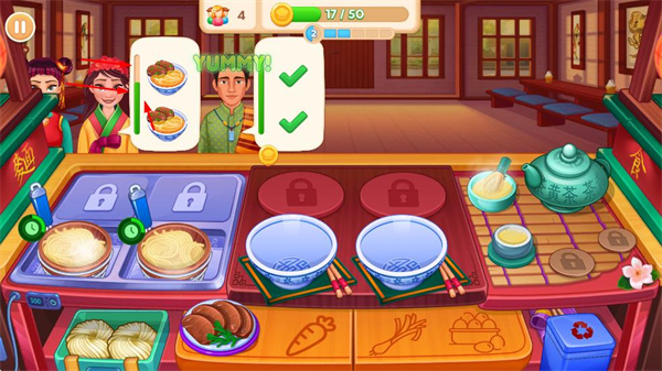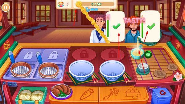 3、將制作好的食物提供給顧客,顧客滿意后會給出TASTY、YUMMY等評價,并獲得金幣獎勵,積累金幣進度。