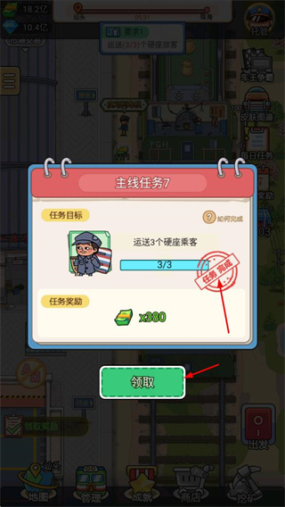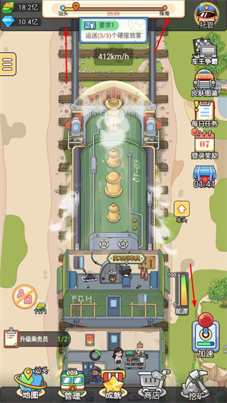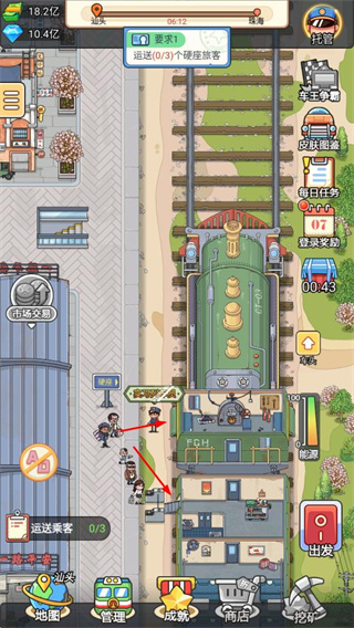 1、在游戲場(chǎng)景中,可管理車站,運(yùn)送乘客,界面會(huì)顯示運(yùn)送乘客的任務(wù)進(jìn)度,點(diǎn)擊出發(fā)按鈕讓列車出發(fā)。