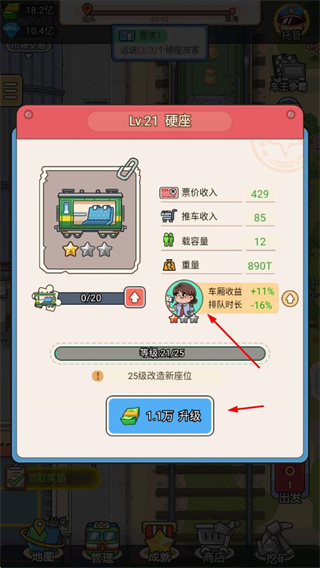 2、可對(duì)列車車廂進(jìn)行升級(jí),消耗資源提升車廂的票價(jià)收入、推車載入、載客量等屬性,還能減少排隊(duì)時(shí)長(zhǎng)。
