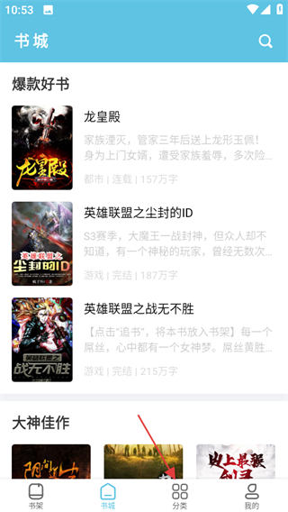 1、進入滾滾小說書城頁面,點擊底部分類,進入分類頁面。