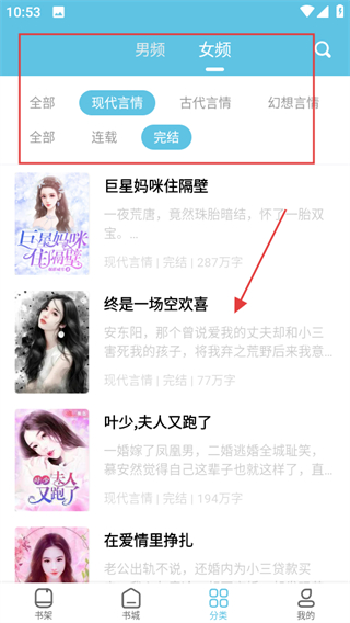 2、在分類頁面,選擇女頻及相關子分類,點擊感興趣的小說進入。