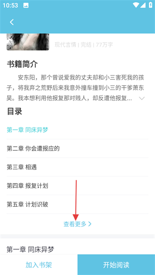 3、進入書籍簡介頁面后,點擊查看更多,查看完整目錄。