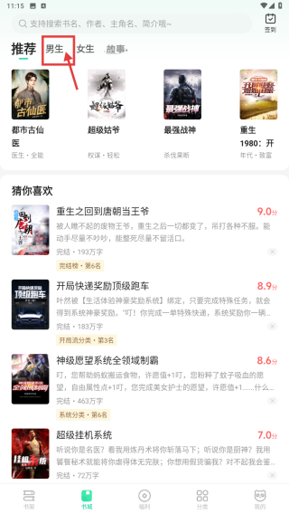 1、打開小說閱讀APP,點擊頂部男生分類標(biāo)簽,切換到男生小說推薦頁面。
