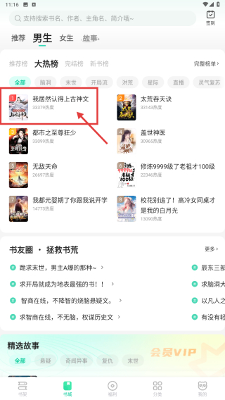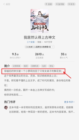 3、在大熱榜列表中,點擊我居然認(rèn)得上古神文小說條目,進入小說詳情頁。