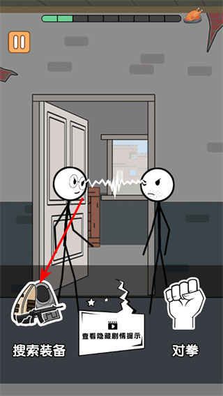 4、在遇到人物或場(chǎng)景時(shí),選擇搜索裝備選項(xiàng),防具等裝備,提升火柴人的生存。