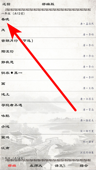 3、在教材列表頁(yè),能看到部編版等不同版本、各年級(jí)的古詩(shī),想學(xué)習(xí)的篇目并點(diǎn)擊。