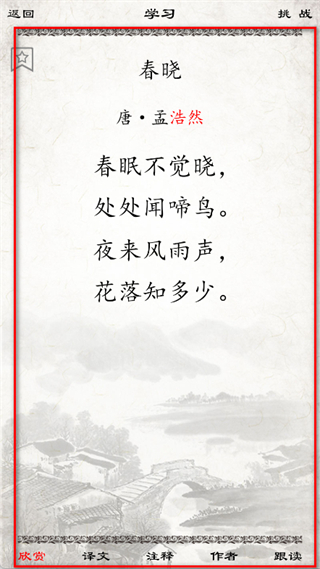 4、進(jìn)入古詩(shī)學(xué)習(xí)頁(yè),查看原文,頁(yè)面下方功能,方便隨時(shí)隨地學(xué)習(xí)小學(xué)必背古詩(shī)。